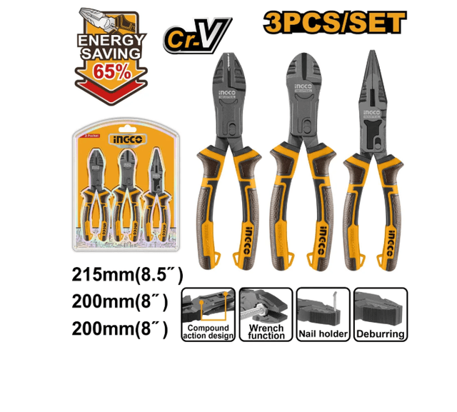 Размер: Комбинированные плоскогубцы комбинированного действия 8 дюймов. Диагональные кусачки 8 дюймов комбинированного действия. Длинногубцы 8,5 дюйма. Экономия энергии на 65 % по сравнению с обычными плоскогубцами. Материал: Cr-V Обработка поверхности: тефлоновое покрытие Трехцветная ручка из TPR для надежного захвата и комфорта С функцией держателя гвоздя С функцией гаечного ключа С функцией удаления заусенцев Упаковано в полудвойной блистер