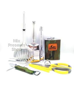 Набор подарочный "Охотник" 9 в 1станет отличным, а главное полезным подарком вашим близким и знакомым. Наборпо достоинству оценят рыбаки, охотники, а также просто любители выезжать на природу. Благодаря своим компактным размерам, набор удобно всегда и везде брать с собой! Ни один мужчина не сможет устоять перед подобным набором и будет благодарен за подобный презент. Комплектация: <ul><li>Фляга (Объем: 9 oz/ 267 мл);</li><li>Салфетка махровая;</li><li>Доска разделочная;</li><li>Ножницы разделочные;</li><li>Лейка;</li><li>Щипцы;</li><li>Лопатка для гриля;</li><li>Нож мултитул (нож, открывалка, штопор)</li><li>Шумовка</li></ul>Это отличный подарок мужу, коллеге, брату, начальнику, папе, другу. (Ремень для подвеса в комплекте)