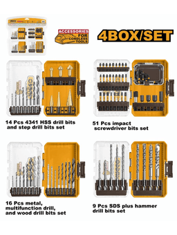 В набор из 4 принадлежностей входят: 1 набор из 16 сверл по металлу, многофункциональных дрелей и сверл по дереву: шестигранный хвостовик 6 сверл по металлу: 2,3,4,5,6,8 мм 5 многофункциональных сверл: 4,5,6,8,10 мм 5 сверл по дереву: 4,5,6,8,10 мм 1 набор из 9 сверл SDS plus для ударных инструментов: 6x110 мм, 8x110 мм, 6x160 мм, 6x160, 8x160 мм, 10x160 мм, 12x160 мм, 14x160 мм, 16x160 мм 1 набор из 51 ударной отвертки: 29 ударных отверток диаметром 25 мм: PH1/PH2/PH2/PH2/PH3/PZ1/PZ2/PZ2/PZ2/PZ3/SL4/SL5/SL5/SL5.5/SL6/T10/T15/T20/T20/T25/T25/T27/T30/T35/T40/H3/H4/H5/H6 17 шт. 50 мм биты для ударной отвертки: PH1/PH2/PH2/PH3/PZ1/PZ2/PZ2/PZ3/SL4/SL5/SL5/SL6/T15/T20/T25/T27/T30 3 шт. 48 мм магнитные гайки: 6,8,10 мм 1 шт. держатель бит для ударной отвертки 1 шт. держатель бит для ударной отвертки с фиксатором 1 набор из 14 шт. 4341 набор сверл и ступенчатых сверл: 8 шт. сверл 4341 HSS: 2/3/3/4/4/5/6/8 мм, шестигранный хвостовик 3 шт. ступенчатых сверл: 4-12 мм 5-ступенчатых, 4-12 мм 9-ступенчатых, 4-22 мм 10-ступенчатых 3 шт. зенковочных сверла 12,4/16,5/20,5 мм Упакованы в двойной блистер