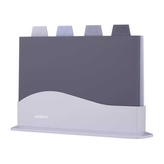 Набор разделочных досок Ardesto AR1404GB — это идеальное сочетание гигиены, функциональности и современного дизайна для вашей кухни. Набор включает в себя четыре доски, предназначенные для разных типов продуктов, что исключает смешивание запахов и бактерий. Компактная подставка обеспечивает удобное хранение и быстрый доступ к каждой доске, экономя место на рабочей поверхности. Технические характеристики и особенности: Количество в наборе: 4 разделочные доски и стильный кейс-подставка. Материал: Высококачественный пищевой пластик. Материал долговечен, не тупит ножи и не впитывает запахи продуктов. Маркировка: Каждая доска имеет специальную иконку-ярлык (рыба, мясо, овощи, готовые продукты) для соблюдения санитарных норм. Двустороннее использование: Доски можно использовать с обеих сторон, что продлевает срок их службы. Уход: Доски легко моются вручную и подходят для очистки в посудомоечной машине. Безопасность: Не содержит вредных веществ (BPA Free), что гарантирует безопасность для здоровья вашей семьи.