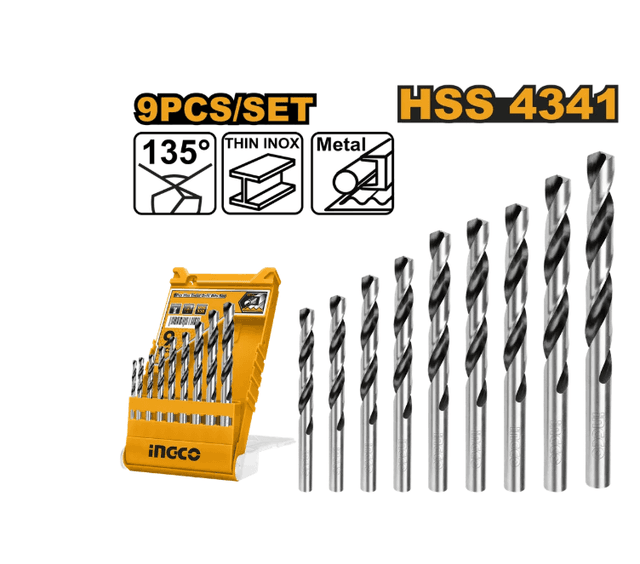 Набор спиральных сверл HSS 4341, 9 шт. Размер: 2,3,3,5,4,4,5,5,6,8,10 мм. Упаковано в пластиковую коробку.