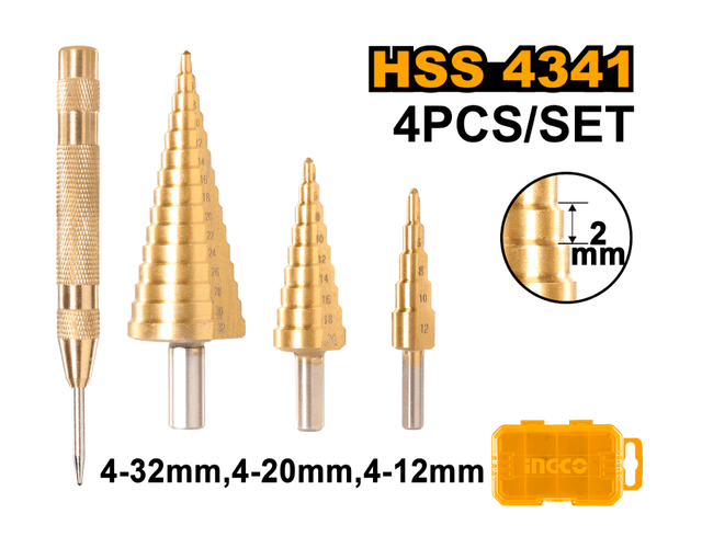 3 ступенчатых сверла с 1 автоматическим кернером 1 шт. 4-12 мм, 2 мм/шаг 1 шт. 4-20 мм, 2 мм/шаг 1 шт. 4-32 мм, 2 мм/шаг Материал: HSS 4341 Упаковано в пластиковую коробку