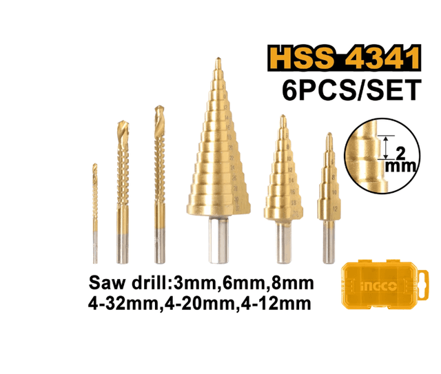 3 шт. Ступенчатое сверло с 3 шт. Сверло-пила 1 шт. 4-12 мм, 2 мм/шаг 1 шт. 4-20 мм, 2 мм/шаг 1 шт. 4-32 мм, 2 мм/шаг Сверло-пила: 3 мм, 6 мм, 8 мм Материал: HSS 4341. Упакован в пластиковую коробку.
