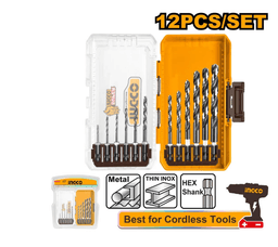 INGCO AKDL11206 INDUSTRIAL — набор спиральных свёрл по металлу, в комплекте 12 шт. Основные характеристики: назначение: для работы по металлу; материал: быстрорежущая сталь HSS (HSS 4341); тип хвостовика: шестигранный (1/4HEX — E); режим работы: без удара; диапазон диаметров: 1–10 мм; длина: 50–130 мм; рабочая длина: 10–90 мм; угол заточки: 135°.