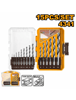 INGCO AKDL51506 INDUSTRIAL — набор спиральных свёрл для работы по металлу, в комплекте 15 шт. Основные характеристики: назначение: создание глухих и сквозных отверстий в чёрных и цветных металлах, чугуне, титане, легированных и нелегированных сталях, а также твёрдых пластмассах; материал: быстрорежущая сталь HSS (HSS 4341); тип хвостовика: цилиндрический; режим работы: без удара; диапазон диаметров: 1–12 мм; длина: 30–140 мм; рабочая длина: 10–100 мм; угол заточки: 135°; соответствие стандарту DIN 338 (ГОСТ 10902-77).