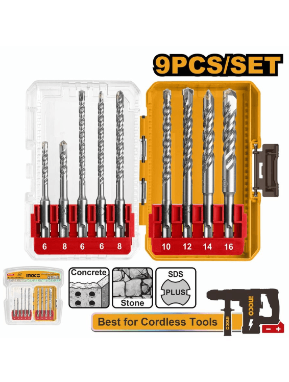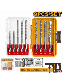 Набор из 9 сверл SDS Plus для перфоратора 6X110 мм, 8X110 мм, 6X160 мм, 6X160 мм, 8X160 мм, 10X160 мм, 12X160 мм, 14X160 мм, 16X160 мм Упаковано в двойной блистер