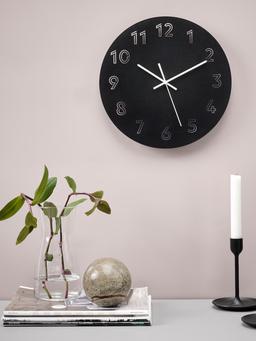 Настенные часы с низким напряжением, чёрного цвета, диаметром 30 см. Точно показывают время и благодаря чёрному цвету подходят для любого интерьера.