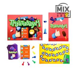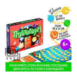 Позитивиум для детей Детская версия легендарной игры «Позитивиум» станет отличным развлечением для вас и вашего ребенка, а также поможет развить коммуникативные навыки и воображение. Цель игры Необходимо первыми добраться до финиша на игровом поле, вытягивая карточки из колоды и объясняя слова, написанные на них. Делать это можно тремя способами: пантомимой, рисунком или словами. Вы сами выбираете слово и видите способ его объяснения. Продумай каждый ход! Поле для игры непростое – на нем есть особые места, попав на которые вы можете переместиться вперед или назад, а также получить специальное задание. Благодаря им можно быстрее обеспечить победу своей команде. Заинтригованы? Тогда скорее открывайте коробку и читайте правила! Что же нужно делать? В игре 100 карточек, на каждой из которых написано по 3 слова, отмеченных разными символами. Эти символы указывают на способ объяснения – рисунок, пантомима или словами. Время не ждет Игра усложняется тем, что время объяснения слова строго ограничено, для этого в наборе предусмотрены песочные часы. Объясняющий выбирается заранее. Если команда правильно угадала слово, она продвигается вперед, если не успела угадать – остается на месте. Возраст: 6+