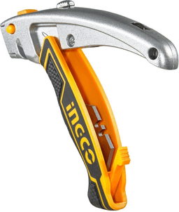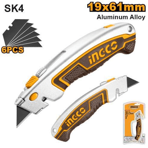 Нож универсальный 170 INGCO HUK6128 - это универсальный инструмент, имеющий широкую сферу применения - с помощью него можно быстро и аккуратно разрезать такие материалы, как линолеум, картон, обои и др. Материал корпуса - алюминиевый сплав, обеспечивает приспособлению защиту от различных механических воздействий и, как следствие, гарантирует продолжительный рабочий ресурс. Есть возможность промежуточного закрепления лезвия. В ручке предусмотрен отсек для хранения 5 лезвий. Тип - не складной Общая длина- 170 мм Размер лезвия: 61х19 мм Лезвие толщиной - 0.6 мм Материал лезвия - углеродистая сталь SK5 Твердость стали - 58-62 HRC Материал рукояти - алюминий + нескользящая накладка В комплекте 6 лезвий