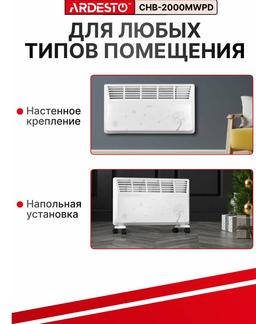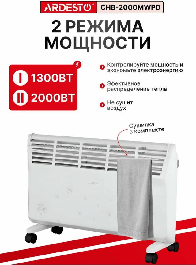 Конвектор Ardesto CHB-2000MWPD — это надежное и эффективное решение для обогрева помещений площадью до 20 квадратных метров. Благодаря продуманной конструкции и высокой мощности, прибор быстро создает комфортную температуру, работая практически бесшумно. Лаконичный белый дизайн позволяет обогревателю гармонично вписаться в любой интерьер, обеспечивая тепло и уют в холодное время года. Технические характеристики и особенности: Мощность: 2000 Вт. Обеспечивает быстрый нагрев воздуха за счет естественной конвекции. Управление: Механическое, с удобными поворотными регуляторами для настройки температуры. Режимы работы: Возможность выбора мощности для оптимального энергопотребления. Безопасность: Встроена защита от перегрева, что гарантирует спокойствие при длительном использовании. Установка: Универсальная — комплектуется ножками для напольной установки, также возможен настенный монтаж.