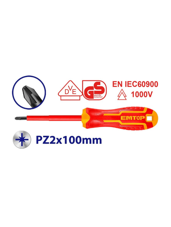 Отвертка диэлектрическая (изолированная) EMTOP ESDRJPZ2100 EMTOP ESDRJPZ2100 — это профессиональная изолированная отвертка с профилем Pozidriv (PZ2), предназначенная для электромонтажных работ под напряжением до 1000 В. Стержень изготовлен из прочной хромованадиевой стали (Cr-V) и полностью защищен диэлектрическим слоем. Наконечник типа PZ обеспечивает максимально плотное сцепление с крепежом, предотвращая соскальзывание и повреждение шлица, что особенно важно при работе с современными электрощитами и клеммами. Характеристики: Тип наконечника: PZ2 (Pozidriv); Длина стержня: 100 мм; Максимальное напряжение: 1000 В; Материал: Хромованадиевая сталь (Cr-V); Особенности: Диэлектрическая изоляция, намагниченное жало, эргономичная рукоятка.