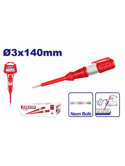 Индикаторная отвертка (тестер) EMTOP ETPL14001 EMTOP ETPL14001 — это компактный и надежный инструмент, предназначенный для определения наличия переменного напряжения (AC) в диапазоне от 100 до 500 В. Она является незаменимым помощником как для профессиональных электриков, так и в быту для быстрой проверки исправности розеток, выключателей и проводки. Полностью изолированный корпус и рукоятка из прозрачного пластика обеспечивают безопасность и позволяют четко видеть свечение неонового индикатора. Характеристики: Диапазон напряжения: AC 100–500 В; Размер шлица: SL3.0 (плоский); Длина стержня: 140 мм; Тип индикации: Неоновая лампа; Особенности: Полная изоляция, удобный зажим (клипса) для крепления на кармане.