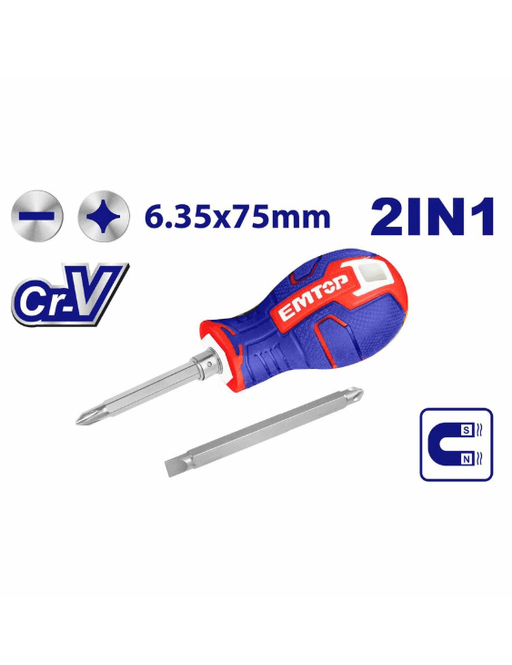 Отвертка со сменной насадкой 2 в 1 EMTOP ESDRH0201 EMTOP ESDRH0201 — это практичная и компактная отвертка со съемным двусторонним стержнем. Инструмент сочетает в себе сразу два самых популярных наконечника: плоский (SL) и крестовой (PH). Стержень изготовлен из прочной хромованадиевой стали (Cr-V) и имеет стандартный размер посадки 6.35 мм. Благодаря переставной конструкции, этот инструмент заменяет две полноценные отвертки, экономя место в сумке или ящике для инструментов. Характеристики: Тип: Двусторонняя (2 в 1); Размер наконечников: PH2 + SL6.0; Размер стержня: 6.35 x 75 мм; Материал: Хромованадиевая сталь (Cr-V); Особенности: Переставной стержень, магнитный наконечник, эргономичная рукоятка.