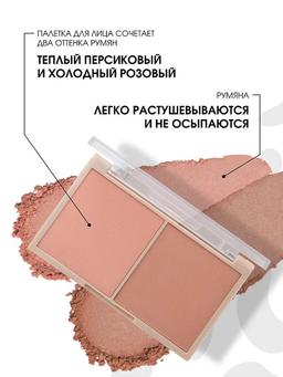 Характеристики Цвет: №01 ТЕПЛЫЙ ПЕРСИКОВЫЙ, ХОЛОДНЫЙ РОЗОВЫЙ Объем: 10gr Описание Совершенный румянец, как после регулярного посещения спа и косметолога, — все возможно благодаря платиновой BLUSH CARD от STELLARY. Палетка для лица из коллекции SEXY&RICH сочетает два классических оттенка румян: теплый персиковый и холодный розовый. Они придают коже естественный освежающий розовый тон. Румяна с пудровой текстурой легко растушевываются, не осыпаются и стойко держатся на коже. Двойные румяна можно использовать для создания классического макияжа, лифтинг-эффекта, образа в стиле baby doll и sun kiss, а также для техники draping. Благородные цвета упаковки в бежево - коричневых тонах дополнены золотыми элементами. Способ применения Для классического образа наносите румяна на щеки, чтобы добавить игривость макияжу. Для образа в стиле baby doll наносите румяна от уха до уха через щеки, скулы и переносицу для создания нарочито юного эффекта кукольного лица. Чтобы повторить трендовый прием draping, помогающий быстро придать лицу свежесть, смешайте два оттенка румян и растушуйте в форме цифры 3: от брови к глазу и под скулу. Для создания лифтинг-эффекта наносите румяна от скулы, двигаясь к вискам, вытягивая почти в вертикальную линию, чтобы придать лицу более подтянутый вид. Для макияжа в стиле sun kiss с освежающим эффектом, будто вы весь день провели на солнце, нанесите персиковый оттенок размашистыми движениями на спинку носа, лоб и щеки, а розовым подчеркните скулы.