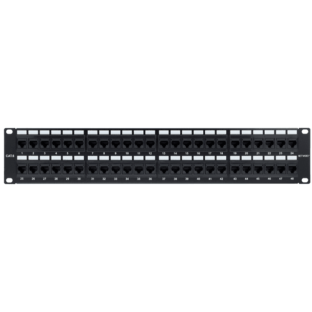 Профессиональное сетевое оборудование, предназначенное для коммутации большого количества соединений в ограниченном пространстве серверной стойки. Занимая всего 2U (или 1U в моделях высокой плотности), эта панель обеспечивает подключение 48 рабочих мест или устройств. Основные характеристики: Количество портов: 48 портов RJ-45. Категория: Cat.6 (поддержка Gigabit Ethernet и скорости до 10 Гбит/с на коротких дистанциях). Монтаж: Установка в стандартный 19-дюймовый шкаф/стойку. Конструкция: Жесткий металлический каркас, минимизирующий наводки и помехи. Контакты: IDC-разъемы с цветовой схемой T568A/B для быстрой расшивки. Преимущества: Экономия места: Высокая плотность портов позволяет компактно разместить сетевые узлы. Надежность: Категория 6 гарантирует стабильную работу при интенсивном трафике. Удобство: Пронумерованные лицевые панели для легкой идентификации каждого соединения.