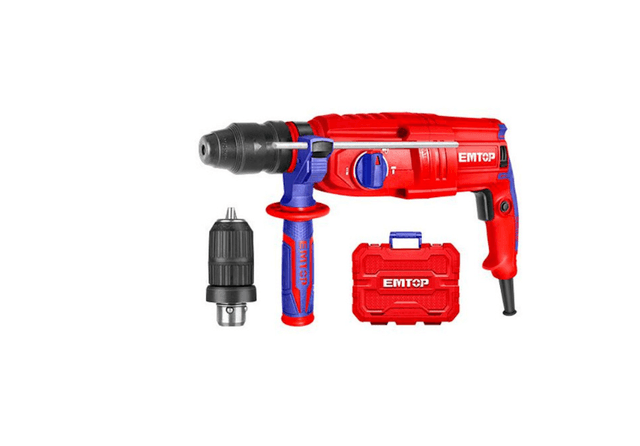 EMTOP ERHRL802 — мощный и надёжный электрический перфоратор, предназначенный для сверления, ударного сверления и долбления в различных материалах. Оснащён системой патрона SDS-Plus для быстрой и удобной смены оснастки. Идеален для профессионалов и домашних мастеров, выполняющих строительные и ремонтные работы. Основные характеристики: Тип двигателя: электрический Напряжение: 220–240 В ~ 50/60 Гц Входная мощность: 800 Вт Скорость без нагрузки: до 1100 об/мин Частота ударов: до 4000 уд/мин Энергия удара: 2,5 Дж Макс. диаметр сверления: бетон — 26 мм дерево — 30 мм металл — 13 мм Патрон: SDS-Plus Режимы работы: сверление, ударное сверление, долбление Реверс: да