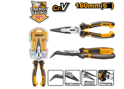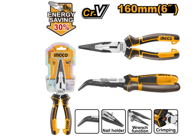 Размер: 6 дюймов/160 мм. Экономия энергии на 30 % по сравнению с обычными плоскогубцами. Материал: Cr-V Обработка поверхности: черная отделка и полировка Трехцветная ручка из TPR для надежного захвата и комфорта С функцией обжима С функцией держателя гвоздя С функцией гаечного ключа Упаковано в полудвойной блистер