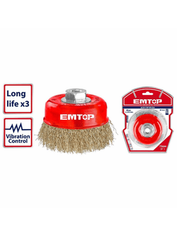 EMTOP EWCB11005 — проволочная щётка с мягкой щетиной для зачистных работ. Некоторые характеристики: диаметр: 100 мм; тип: M14x2; толщина проволоки: 0,3 мм; длина проволоки: 30 мм; RPM: 8500 об/мин. Подходит для обработки: стали, литой стали, мягкой и твёрдой древесины.
