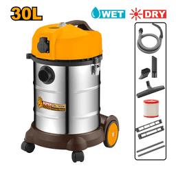 Пылесос строительный INGCO VC14301 INDUSTRIAL предназначен предназначен для сбора древесных стружек, опилок, пыли, легких фракций строительного мусора, образовавшегося при работе ручных и средних машин и сбора воды с поверхности пола. Идеален для уборки промышленных помещениях гаражей, мастерских. Бак из нержавеющей стали объёмом 30 литров не подвергается коррозии и увеличивает срок службы. Встроенная розетка позволяет подключать инструмент одновременно с запуском пылесоса. Тип инструмента: Пылесос строительный Линейка: INDUSTRIAL Модель: INGCO VC14301 Мощность: 1400 Вт Напряжение: 220-240В~50/60 Гц Мощность встроенной розетки: 2000 Вт Вакуумное давление: 18 кПа Расход воздуха: 1,9 куб.м/мин Емкость пылесборника: 30 л Тип пылесборника: мешок/контейнер Диаметр всасывающего шланга: 32 мм Длинна всасывающего шланга: 1,85 м Длина кабеля: 1,8 м Уровень шума: 83 дБ Фильтр тонкой очистки (НЕРА) - есть Розетка для электроинструмента - есть Упаковка: Картонная коробка Вес: Нетто - 9,0 кг; Брутто – 10,0 кг Параметры упакованного товара: Длина- 45 см; Ширина- 42 см; Высота- 62 см