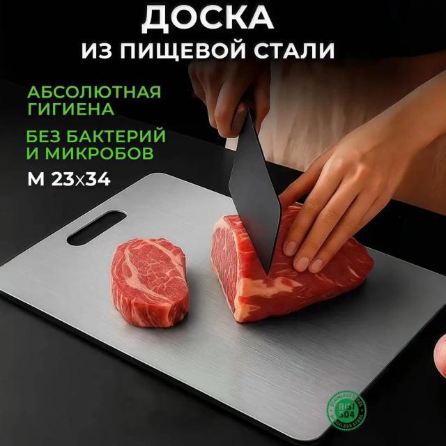 Современная и гигиеничная альтернатива деревянным и пластиковым доскам. Изготовлена из пищевой нержавеющей стали, что делает её идеальным выбором для долговечного использования на кухне. Особенности: Абсолютная гигиеничность: Поверхность не имеет пор, поэтому не впитывает запахи и не накапливает бактерии. Долговечность: Не трескается, не деформируется и не портится от влаги или горячей посуды. Легкий уход: Легко моется и мгновенно сохнет, можно использовать в посудомоечной машине. Универсальность: Подходит для нарезки любых продуктов, а также для раскатки теста (оно не прилипает к холодному металлу). Эстетика: Стильный дизайн, который подчеркивает современный интерьер кухни.
