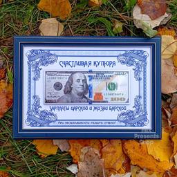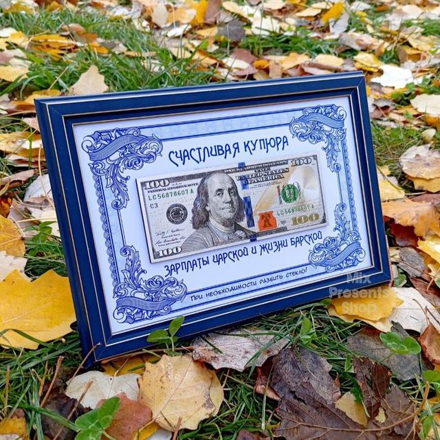 "Счастливая купюра" в рамке — оригинальный сувенир, который станет не только магнитом для денег, но и стильным украшением кабинета или комнаты. Банкнота дополнена ножкой, благодаря которой её можно поставить на стол или полку. Отличная идея для подарка как на день рождения и юбилей, так и на Новый Год! Получатель такого оригинального сувенира будет в восторге! Размер: 26 × 18 × 1.5 см