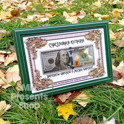 "Счастливая купюра" в рамке — оригинальный сувенир, который станет не только магнитом для денег, но и стильным украшением кабинета или комнаты. Банкнота дополнена ножкой, благодаря которой её можно поставить на стол или полку. Отличная идея для подарка как на день рождения и юбилей, так и на Новый Год! Получатель такого оригинального сувенира будет в восторге! Размер: 26 × 18 × 1.5 см