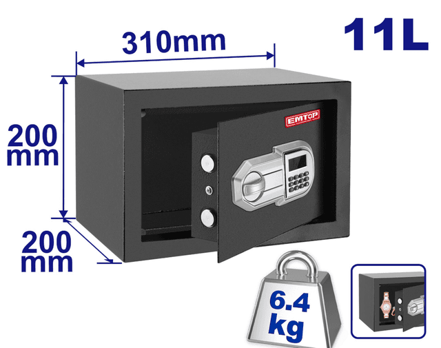 Внешние размеры (В Ш Г): 8 х 12 х 8 дюймов (20 х 31 х 20 см) Объем: 11 л Толщина (дверная панель/корпус коробки): 4/2 мм Может свободно регистрировать 3–8-значный код Вес нетто: 6,4 кг Крепление: можно закрепить на стене или полу В комплекте: 1 сейф, 2 механических ключа, 1 руководство пользователя/инструкция по монтажу, 2 дюбель-расширителя Упаковано в цветную коробку