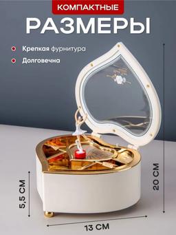 Шкатулка для украшений отлично подойдет для хранения драгоценных украшений, бижутерии и других мелочей! Такие шкатулки благодаря своему размеру удобны для использования как женщин, так и мужчин, которые ищут элегантный и практичный способ хранения своих украшений. Более того, она оснащена музыкальным сопровождением при открытии и скользящей по зеркалу балериной (с металлическим заводом), что делает ее использование манящим и притягательным моментом. Наши шкатулки оснащены отделениями, в которые можно удобно разместить кольца, сережки, цепочки, браслеты и Другие украшения. Размер: 20 × 15 × 7см