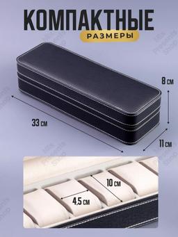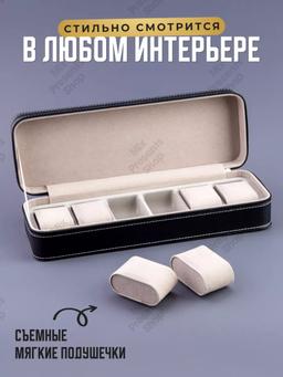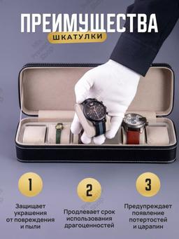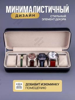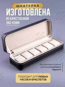 Шкатулка органайзер для часов (6 ячеек) Элегантная шкатулка для часов и украшений с 6 отделениями практичное решение для организации и хранения аксессуаров, драгоценностей и бижутерии. Изысканный дизайн позволяет легко вписаться в любой интерьер и оформление дома или квартиры. Универсальная большая шкатулочка черного цвета станет оригинальным презентом и находкой как для мужчины, так и женщины, которые следят за своими вещами и любят порядок во всем. А также подчеркнет индивидуальность и хороший вкус. Сделана из качественной ЭКО кожи. Отличная идея для подарка!