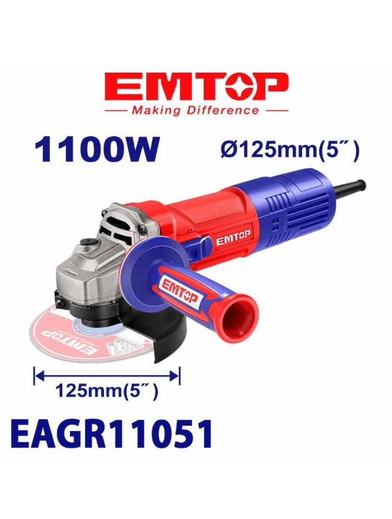 EMTOP EAGR11051 — мощная полупрофессиональная угловая шлифовальная машина (болгарка). Предназначена для шлифовки, резки, зачистки, обдирки, полировки металла, удаления ржавчины и старых слоёв краски. Некоторые характеристики: напряжение тока в сети: 220–240 В; частота тока в сети: 50–60 Гц; потребляемая мощность: 1100 Вт; количество оборотов без нагрузки: 12 000 об/мин; диаметр шлифовального или отрезного диска: 125 мм; длина сетевого кабеля: 2 м; резьба на валу (шпинделя): М14; фиксатор шпинделя;