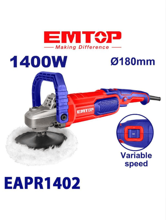 EMTOP EAPR1402 — угловая полировальная машина с электрическим типом питания. Некоторые характеристики: потребляемая мощность: 1400 Вт; скорость холостого хода: 1500–3600 об/мин; диаметр полировальной пластины: 180 мм; вес (брутто): 4 кг; регулировка скорости; выключатель с блокировкой; алюминиевая коробка передач.