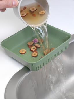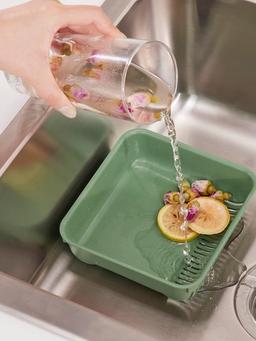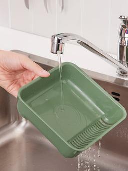 Хорошо подходит для сбора и фильтрации пищевых отходов. Простота в использовании - поместите фильтр прямо в раковину или поместите фильтр на край чаши мойки. Вы также можете использовать его как корзину для хранения посуды, губок или щеток. Прочный, легко чистится и сушится. Выдерживает температуру до +100°C. Его следует регулярно чистить. Высота: 5 см Ширина: 16 см Длина: 17 см