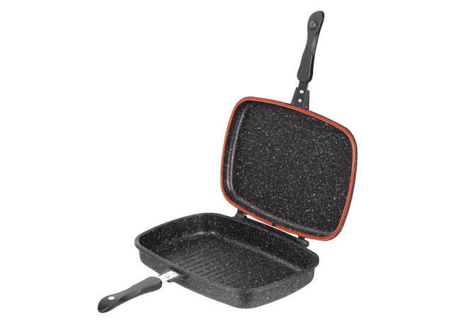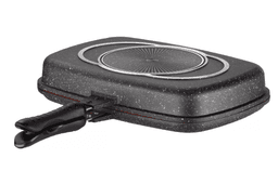 Ardesto AR1936GG — двусторонняя сковорода-гриль модели Gemini Grill. Характеристики: диаметр — 36 см; изготовлена из кованого алюминия; оснащена мраморным антипригарным покрытием; бакелитовые ручки с магнитными фиксаторами; форм-фактор позволяет использовать каждую сторону в качестве крышки, для удобного пролистывания блюда или как вторую поверхность для одновременного приготовления различных блюд. Сковорода совместима с газовыми, электрическими, стеклокерамическими, индукционными и галогенными плитами. Нельзя мыть в посудомоечной машине.