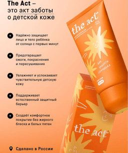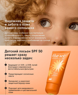 Детский солнцезащитный лосьон SPF 50 благодаря современным химическим фильтрам обеспечивает надёжную защиту от UVA/UVB лучей, предотвращая солнечные ожоги и негативное воздействие ультрафиолета. Обогащённый пантенолом и комплексом пребиотиков, ухаживающий лосьон увлажняет, успокаивает кожу и поддерживает её естественный барьер, обеспечивая максимальный комфорт в течение дня. АРОМАТ: морковь Обьем: 150 мл