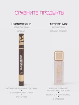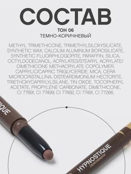 Характеристики Цвет: №06 ТЕМНО-КОРИЧНЕВЫЙ Объем: 0.60gr Описание Созданные, чтобы подчеркнуть красоту твоего взгляда и добавить нотку элегантности в любой образ, тени в стике напоминают о волшебной палочке из сказок Шарля Перро. Они мгновенно преобразят макияж в самый яркий на балу и создадут гипнотический эффект, который будет завораживать и притягивать взгляды. HYPNOSTIQUE обрамляют твои глаза, придавая им магическую глубину — словно ты находишься в центре внимания сказочного принца. Благодаря формату стика тени можно легко и быстро наносить на веки, распределять и смешивать друг с другом, создавая разные образы и градиенты. Кремовая текстура обеспечивает высокую пигментацию, что позволяет добиться яркого и насыщенного цвета. Способ применения Нанесите на чистую кожу век и дайте зафиксироваться в течение 30 секунд. Для более яркого образа нанесите сверху сухие тени.