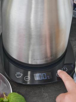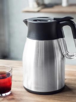 С двустенной термосой из нержавеющей стали. Особенно энергоэффективен благодаря быстрому нагреву.Вакуумная колба сохраняет жидкость теплой без источника питания. Электрическая функция поддержания тепла максимум до 4 часов.Сенсорная панель управления с ЖК-дисплеем.