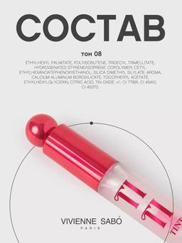Характеристики Цвет: №08 ХОЛОДНЫЙ РОЗОВЫЙ Объем: 3ml Описание TITITINT — восемь тинтов от VIVIENNE SABÓ с совершенно новой инновационной текстурой. Они придают губам стойкий цвет, а также обеспечивают комфорт и увлажнение. Шесть цветных тинтов TITITINT с палитрой от кораллового 01 до насыщенного винного оттенка 06 имеют мягкую гелево-кремовую текстуру для макияжа с влажным финишем. Стойкая и тинтующая, но в то же время нежная текстура обволакивает губы невесомой вуалью, надолго окрашивая их в натуральный оттенок. TITITINT в оттенке 07 и 08 с желейно-масляной текстурой с естественным сиянием на основе увлажняющей формулы питает губы и оставляет глянцевый мокрый финиш для дополнительного объема. Полупрозрачный тинт проявляется спустя несколько минут после нанесения. Специальные пигменты реагируют с индивидуальным PH-фактором кожи, окрашивая губы в подходящий именно тебе розовый цвет: более натуральный оттенок 07 и более яркий оттенок 08. Способ применения Наноси тинт от середины губ к краям. Для того, чтобы добавить губам объем без использования карандаша, нанеси тинт, немного заходя за контур верхней губы.