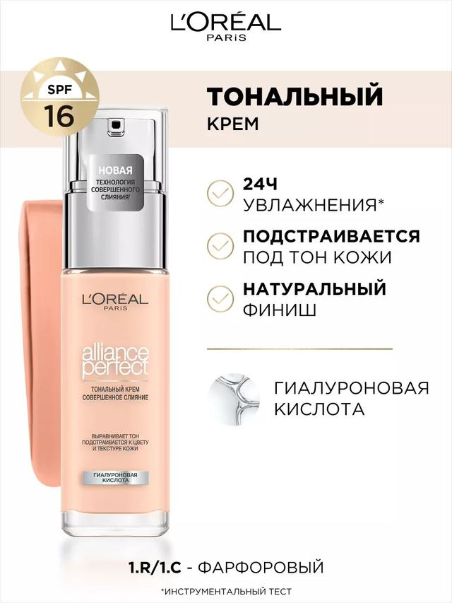 Характеристики Цвет: №R1/C1 ФАРФОРОВЫЙ Объем: 30ml Описание Жидкий тональный крем альянс перфект от L'Oreal Paris выравнивает тон, подстраивается к цвету и текстуре кожи. Заметно преображает кожу за 2 недели применения: кожа более гладкая и сияющая. Ультра-тонкие пигменты подстраиваются под тон и подтон кожи. Формула на 80%, состоящая из увлажняющего крема с гиалуроновой кислотой. 24 часа увлажнения вашей кожи. Естественный финиш, сияющая кожа. SPF 16. Способ применения Наносите крем Alliance Perfect небольшими мазками на предварительно очищенную кожу лица с помощью подушечек пальцев, кисти или спонжа.