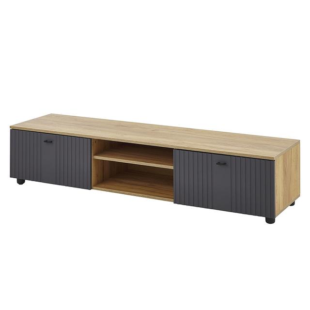Тумба под ТВ из коллекции Барселона Антрацит Тумба под ТВ «Барселона» в цвете Антрацит — это стильная и компактная модель, которая станет настоящим украшением вашего интерьера. Корпус изделия выполнен в декоре под золотистый дуб с выраженной текстурой, а распашные дверцы изготовлены из фрезерованной МДФ с однотонным матовым покрытием антрацитового цвета. Такое сочетание придает мебели элегантный вид и позволяет ей гармонично сочетаться с другими модулями серии «Барселона». Тумба отличается прочностью и устойчивостью, предоставляя удобное место для аппаратуры на открытых полках и скрытое хранение аксессуаров в двух закрытых отделениях. Характеристики: Материал: Высококачественная ДСП и МДФ 18 мм. Цвет: Антрацит / Золотистый дуб. Конструкция: Открытые полки и два закрытых отделения с распашными дверцами. Особенности: Фрезерованные фасады, матовое покрытие, поставляется в собранном виде. Размеры: Высота: 36 см. Ширина: 160 см. Глубина: 40 см. Доставка и установка: Бесплатно.