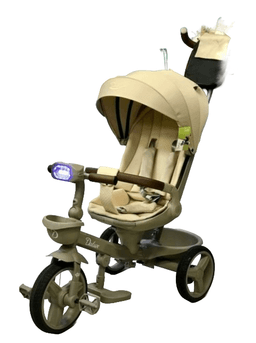 Детский трехколесный велосипед Deluxe (Бежевый) Велосипед Deluxe — это сочетание стиля и функциональности. Модель разработана для детей, которые ценят комфорт, и родителей, которые выбирают надежность. Регулируемый капюшон защитит малыша от солнца, а мягкое сиденье обеспечит правильную поддержку спины. По мере роста ребенка родительскую ручку и капюшон можно снять, превратив коляску в классический трехколесный велосипед. Детали из эко-кожи и премиальные материалы делают эту модель настоящим украшением прогулки.