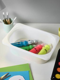 Эта белая коробка размером 20×30×10 см идеально подходит для хранения игрушек, канцелярии и других мелочей, особенно в детской комнате. Легко моется и устойчива к износу.