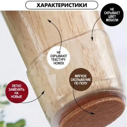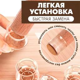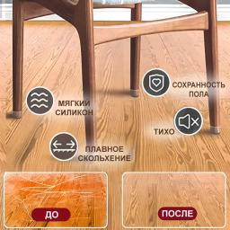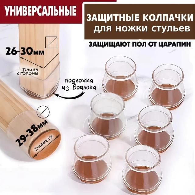 Практичное решение для защиты пола от царапин и устранения лишнего шума при передвижении мебели. Мягкие и эластичные колпачки плотно прилегают к ножкам, обеспечивая плавное и бесшумное скольжение. Особенности: Защита пола: Предотвращают появление царапин и потертостей на ламинате, паркете, линолеуме или плитке. Шумоподавление: Делают передвижение стульев практически бесшумным, избавляя от неприятного скрипа. Универсальность: Благодаря эластичному силикону подходят как для круглых, так и для квадратных ножек разного диаметра. Незаметный дизайн: Прозрачный материал не портит внешний вид мебели и гармонирует с любым интерьером. Простота установки: Легко надеваются без использования клея или инструментов и надежно фиксируются.
