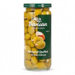 Зеленые оливки с миндалем "Banian", 460 г Премиальное качество из Средиземноморья. Крупные отборные зеленые оливки, фаршированные цельным хрустящим миндалем — это классическое сочетание вкусов, которое станет изысканным дополнением к вашему столу. Особенности продукта: Изысканный вкус: Солоноватый вкус сочной мякоти оливок идеально гармонирует со сладковатым послевкусием жареного миндаля. Идеальная закуска: Готовый аперитив, который отлично сочетается с сырами, белым вином и мартини. Натуральный состав: Продукт не содержит ГМО и искусственных красителей. Польза: Оливки и миндаль богаты витамином Е, антиоксидантами и полезными жирными кислотами. Характеристики: Бренд: Banian Вес нетто: 460 г Состав: Оливки зеленые крупные, ядра миндаля, вода, соль, регуляторы кислотности (лимонная и молочная кислоты). Упаковка: Стеклянная банка (сохраняет свежесть и аромат). Условия хранения: Хранить в сухом прохладном месте. После вскрытия хранить в холодильнике.