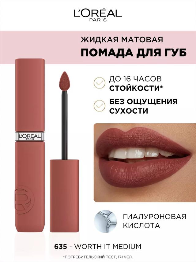 Характеристики Цвет: №635 WORTH IT MEDIUM Объем: 5ml Описание Жидкая матовая помада Infaillible – невесомое пудровое покрытие стойкостью до 16 часов без ощущения сухости. Инновационная формула с увеличенной концентрацией насыщенных пигментов и ухаживающими компонентами. Гиалуроновая кислота для эффекта объемных пудровых губ. Яркий стильный футляр с ультрамягким аппликатором для еще более чувственного и точного нанесения. Тот самый идеальный красный и широкая палитра трендовых нюдовых оттенков для каждой. А ты сможешь устоять? Ты этого достойна. Способ применения Начните нанесение от центра верхней губы по дуге купидона, затем двигайтесь по направлению к уголкам и заполните центр губ.
