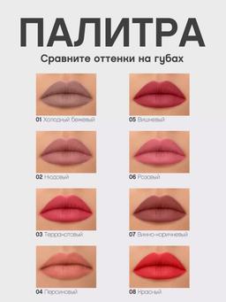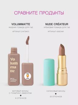 Характеристики Цвет: №01 ХОЛОДНЫЙ БЕЖЕВЫЙ Объем: 5ml Описание VOLUMMATTE — стойкая жидкая помада с матовым финишем и согревающим плампинг-эффектом в восьми оттенках от классического нюдового до насыщенного винного. Она создает идеальное бархатное покрытие, а также делает губы чувственными, выразительными и визуально более объемными. Кремовая высокопигментированная текстура с улучшенной формулой для комфортного матового финиша без липкости быстро фиксируется, не сушит и не стягивает кожу. Помада ложится, как вуаль, равномерно распределяется и оставляет насыщенный цвет с первого нанесения. VOLUMMATTE упакована в лаконичный матовый флакон с покрытием soft-touch в тон помады. Благодаря мягкому аппликатору изогнутой формы удобно детально прокрашивать контур губ без использования карандаша. Способ применения Наносите помаду аппликатором, двигаясь от середины губ к контуру. Для более стойкого макияжа сначала смягчите и выровняйте кожу скрабом, маской или бальзамом.