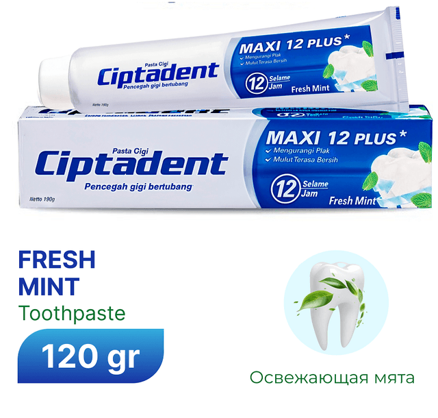 Ciptadent Maxi Fresh Mint 120 г — это зубная паста с освежающим мятным вкусом и приятной прохладой. Она эффективно очищает зубы, помогает предотвратить кариес и укрепляет зубную эмаль благодаря содержанию фторида и других активных компонентов. Паста обеспечивает свежесть дыхания на несколько часов и подходит для ежедневного использования.