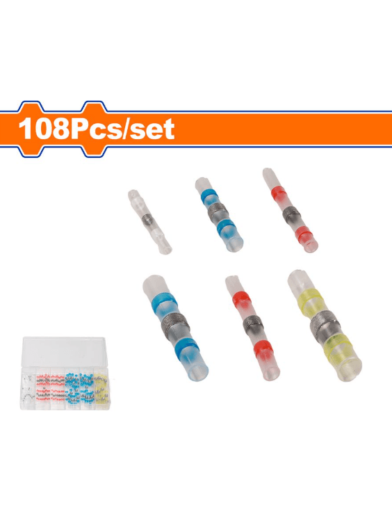 108 sany kebşirleýji (paýka) birleşdirijiler toplumy Materialy: LDPE + poliolefin 18 sany 12–10 AWG 4,0–6,0 mm², sary 36 sany 16–14 AWG 1,5–2,5 mm², gök 36 sany 22–18 AWG 0,5–1,0 mm², gyzyl 18 sany 26–24 AWG 0,25 -0,34 mm², ak Turubajygyň iň pes gysylma (uşadka) temperaturasy: 80 ℃ Galaýynyň iň pes ereme temperaturasy: 138 ℃ Plastik gutuda gaplanan