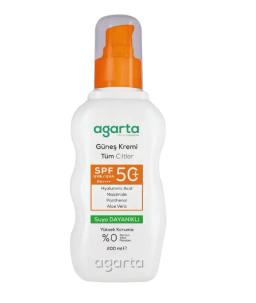 Agarta ähli deri görnüşleri üçin ýokary goragly tebigy güneşe garşy spreý SPF 50, 200 ml