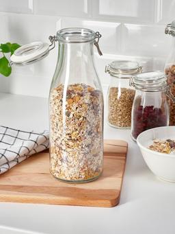 1,4 litr kuwwatly arassa aýnadan ýasalan, gapakly we çüýşe görnüşindäki banka, iýmit we içgileri ygtybarly saklamak üçin amatlydyr.