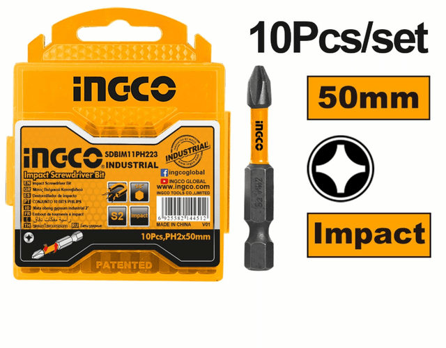 PH2 urgyly bitlar toplumy 10 sany INGCO SDBIM11PH223 INDUSTRIAL altygran sterženli plastik gabynda hödürlenýär. Materialy: S2 polat Ölçegi: 50 mm Şlisi: fillips (PH2)